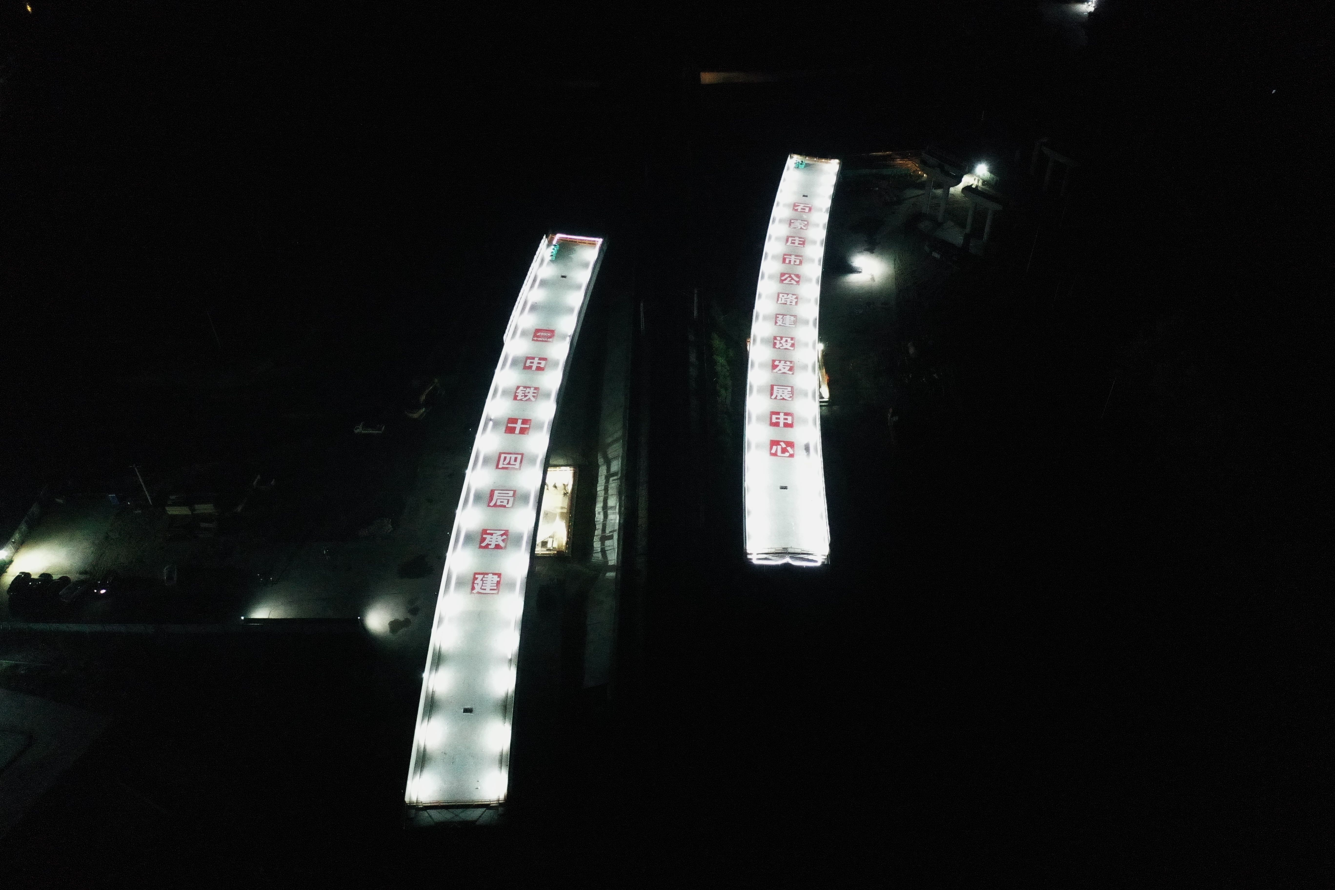 经与铁路部门协调,转体于凌晨1时45分开始,随着转体总指挥一声令下,在4台400吨拉力液压千斤顶的牵引下,2座总重量12000吨的现浇转体桥以每分钟1.2度的角速度左右幅同步缓慢顺时针转动,在灯光的映衬下,转体的桥梁犹如雄鹰展翅般缓缓掠过石德铁路。经过60分钟连续牵引转动,两桥成功跨越石德铁路后精准就位,与相隔7公里的上跨石德铁路1号转体桥遥遥相望。该桥小曲线米,为河北省境内小曲线半径、最大跨度分离式转体桥,本次桥梁成功转体,标志着国道G307晋州绕城段改建工程关键控制性工程取得重大突破。